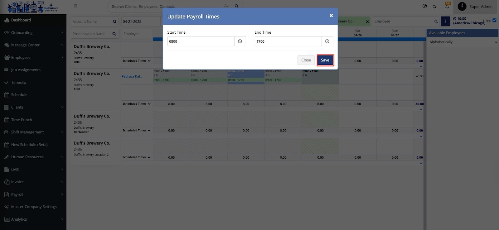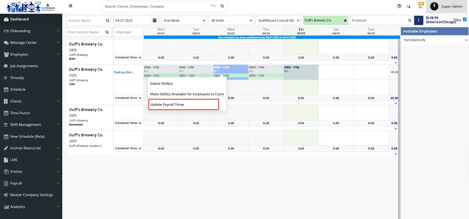 Once you’re on the Schedule Board, locate the employee whose payroll time needs to be updated. Click on their shift to highlight it. After the shift is highlighted, right-click on it to reveal a menu of options. From this menu, select “Update Payroll Times.”