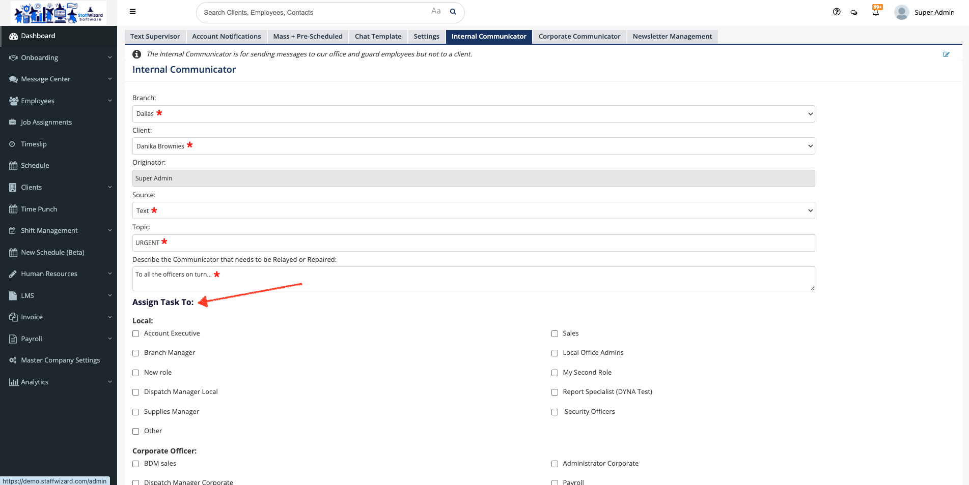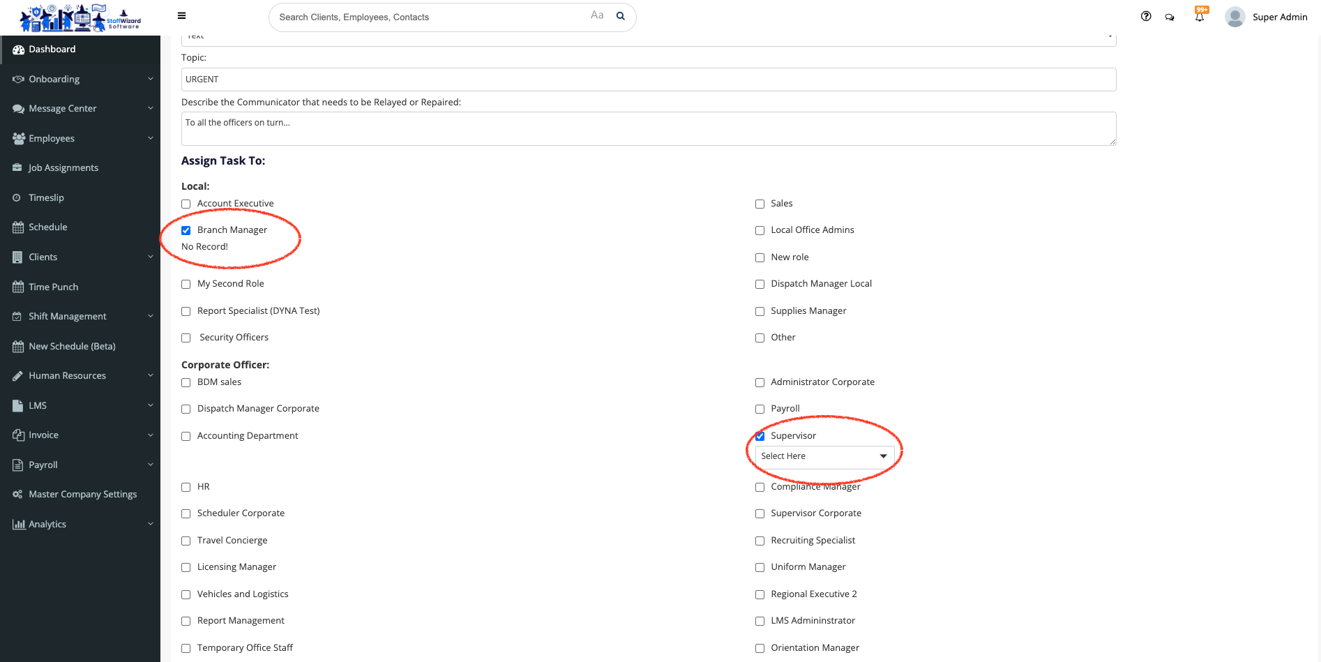This tool can be used to send messages to company employees, whether they are officers or admin staff. Remember that only the admin staff that has a role assigned can use this feature (you need to be sure that the permissions for the Message Center are activated). For any of these cases follow the next steps: