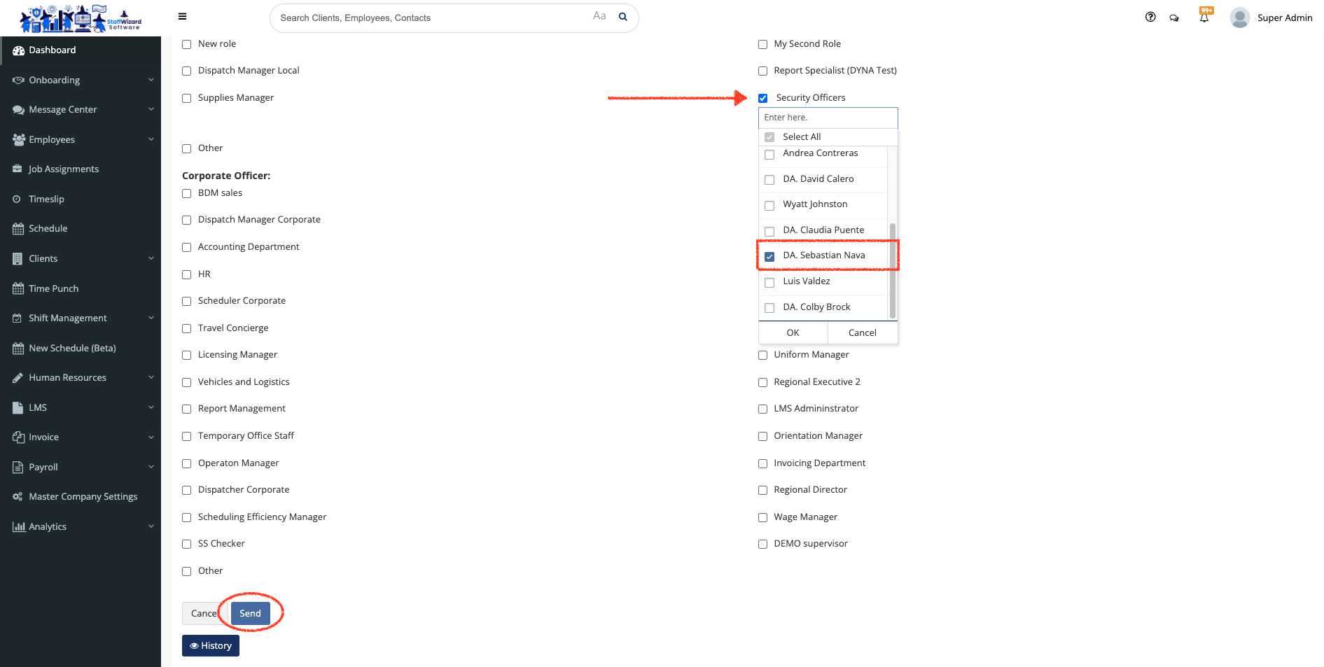 - In this case, we will choose to send a message to the guards. Only employees who have had a shift on any post location of the client selected will appear on the list. Once you are satisfied with the message and the employees you need to send it to, hit the [Send] button at the end of the page.