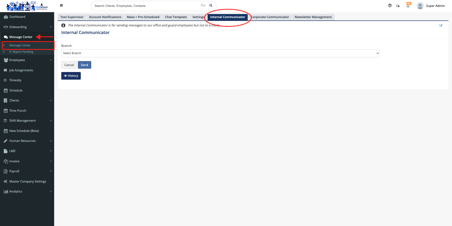 Go to the 'Message Center' tab on the main menu on the left-hand side of the StaffWizard page, and select the "Message Center" option.