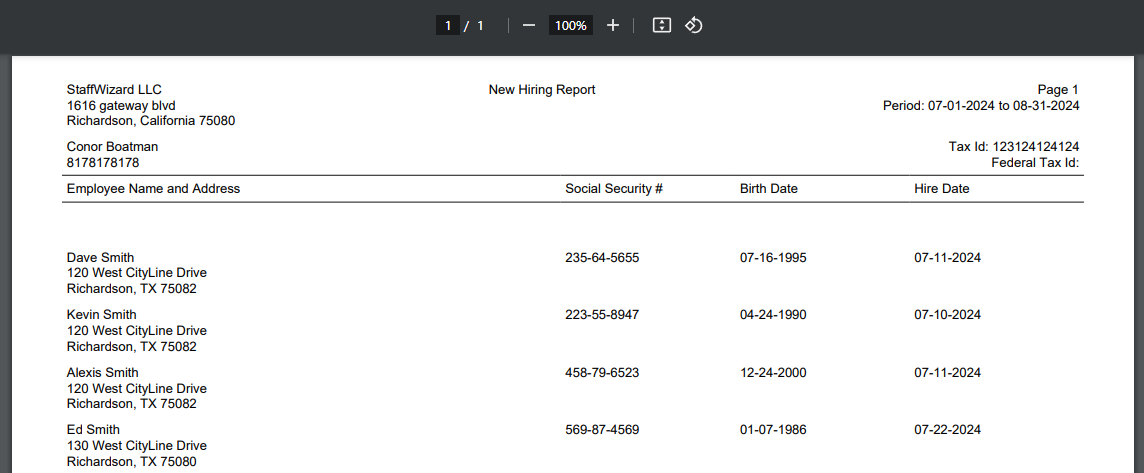 New Hire Report includes detailed information about new employees to assist with onboarding and record-keeping: