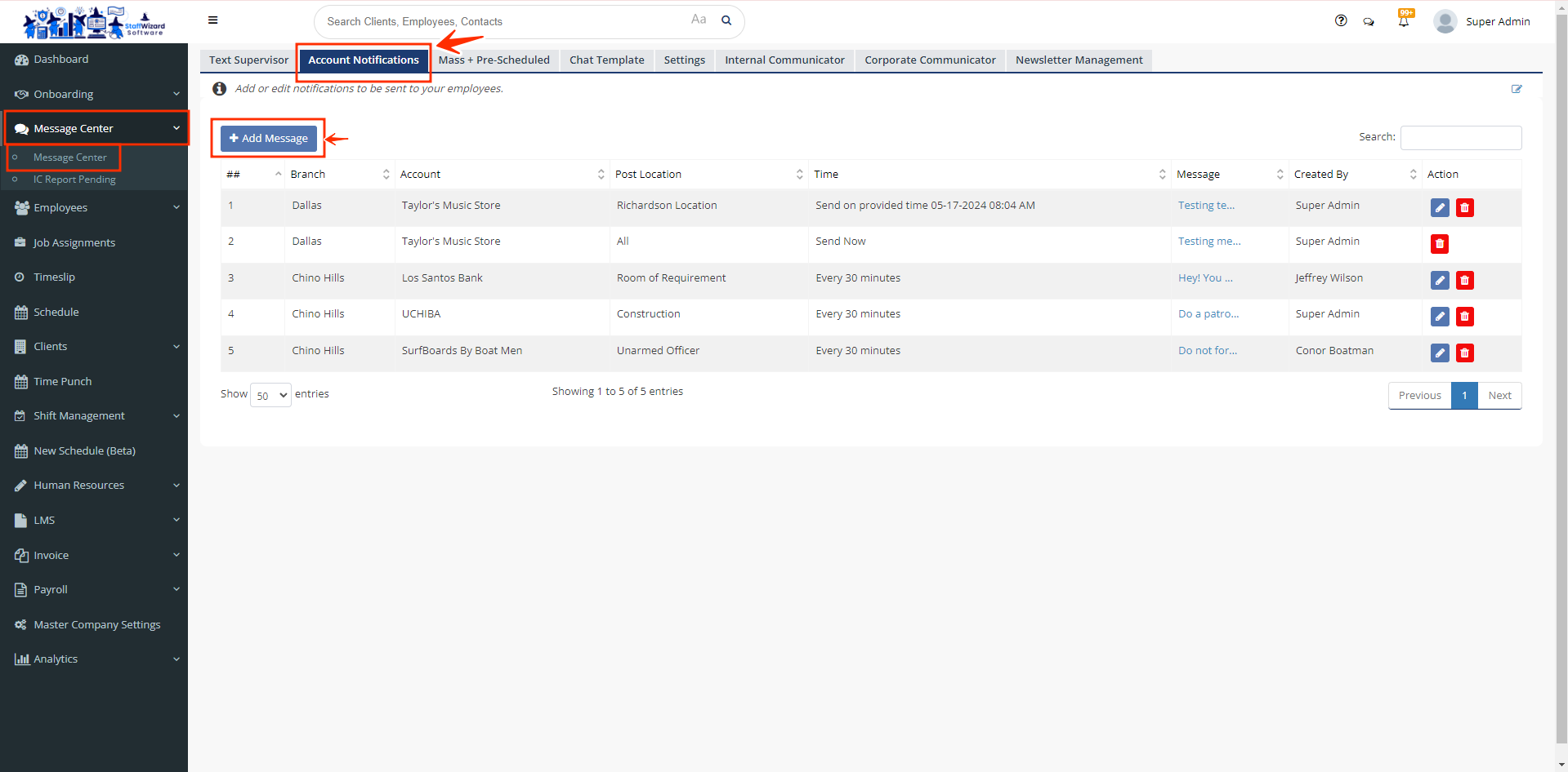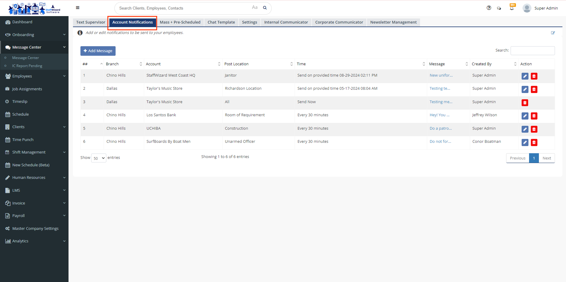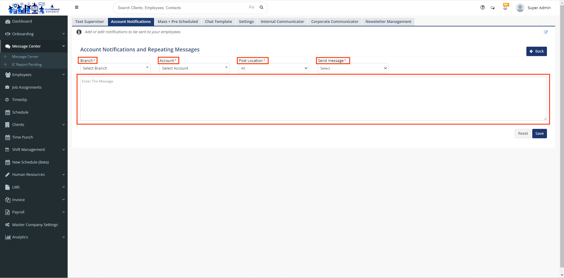 - On the main menu on the left-hand side of your Staffwizard page, click the "Message Center" tab. Then, select the section "Account Notifications".