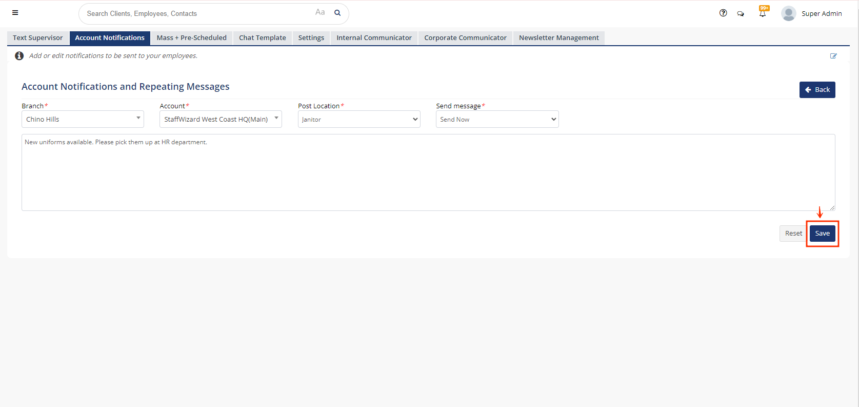 - This will lead you to the page for creating a new notification, where you can set the notification by "Branch", "Account", "Post Location" and "Send Message", the last parameter will be the frequency you want the notification to be sent. Besides, the last field is a text box where you can type the message for your notification.