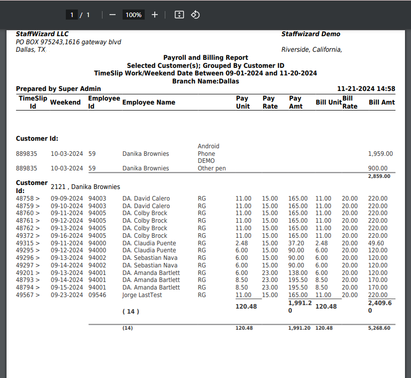 The Payroll & Billing Report provides a comprehensive view of payroll and billing data for both clients and employees. It includes detailed information such as: