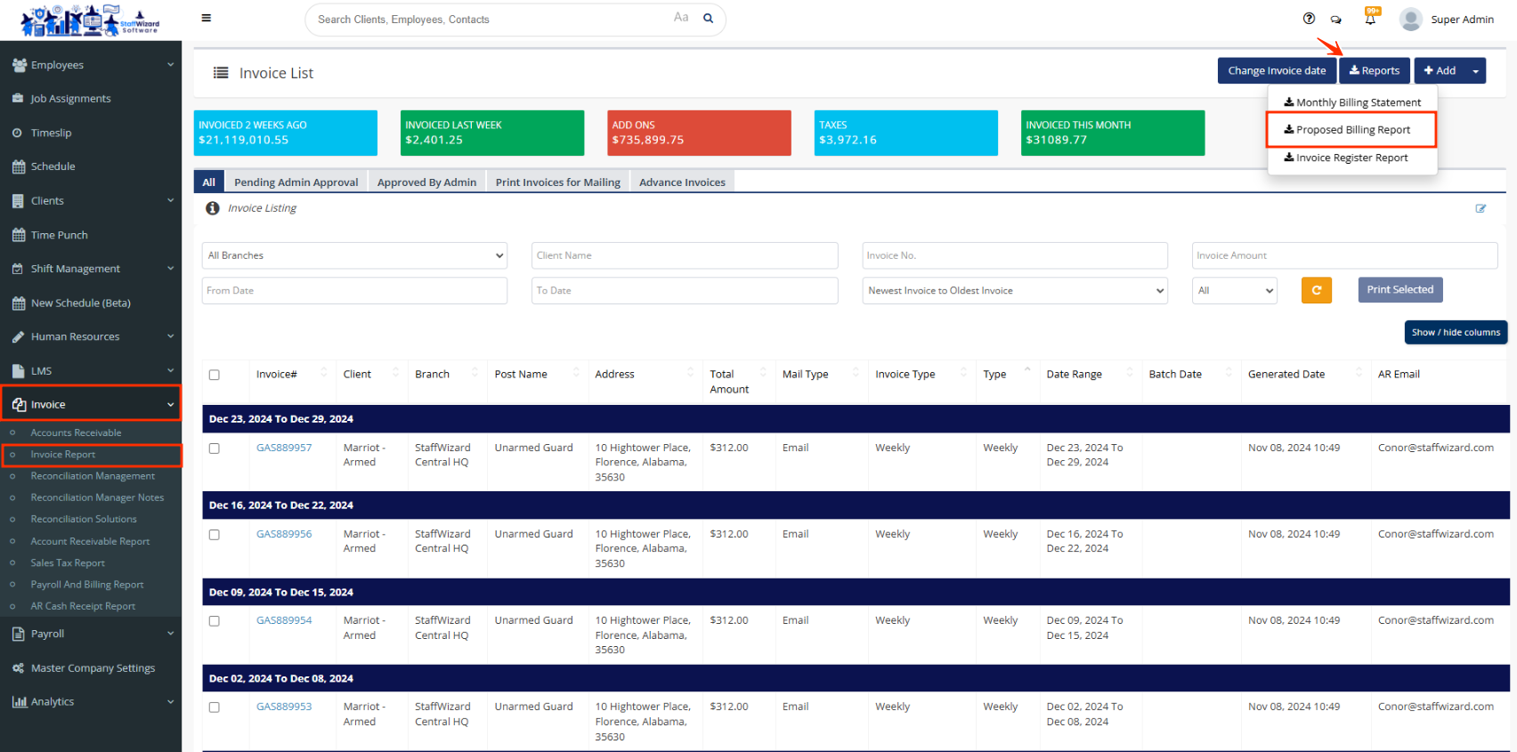 Go to the tab "Invoice", you will see the option "Invoice Report"; open the tab and you will see the button "Reports", click the option "Proposed Billing Report" and set the filters for you to input the information desired for the system to build the report.