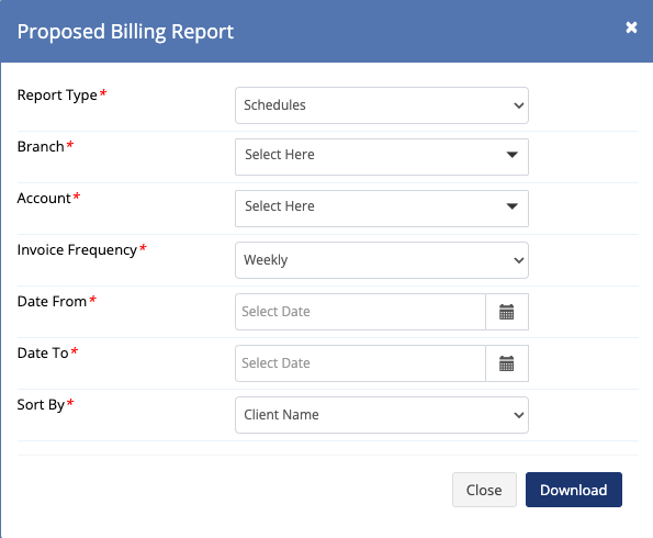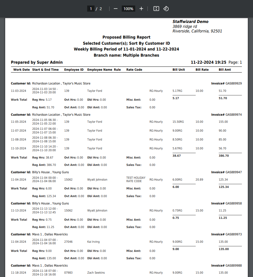 The Proposed Billing Report provides a preliminary invoice that outlines the expected charges for services before the completion of the work week(s). Acting as an estimate, this report offers customers an advanced view of what they will be billed for, enabling better financial planning and transparency. The report includes the following details: