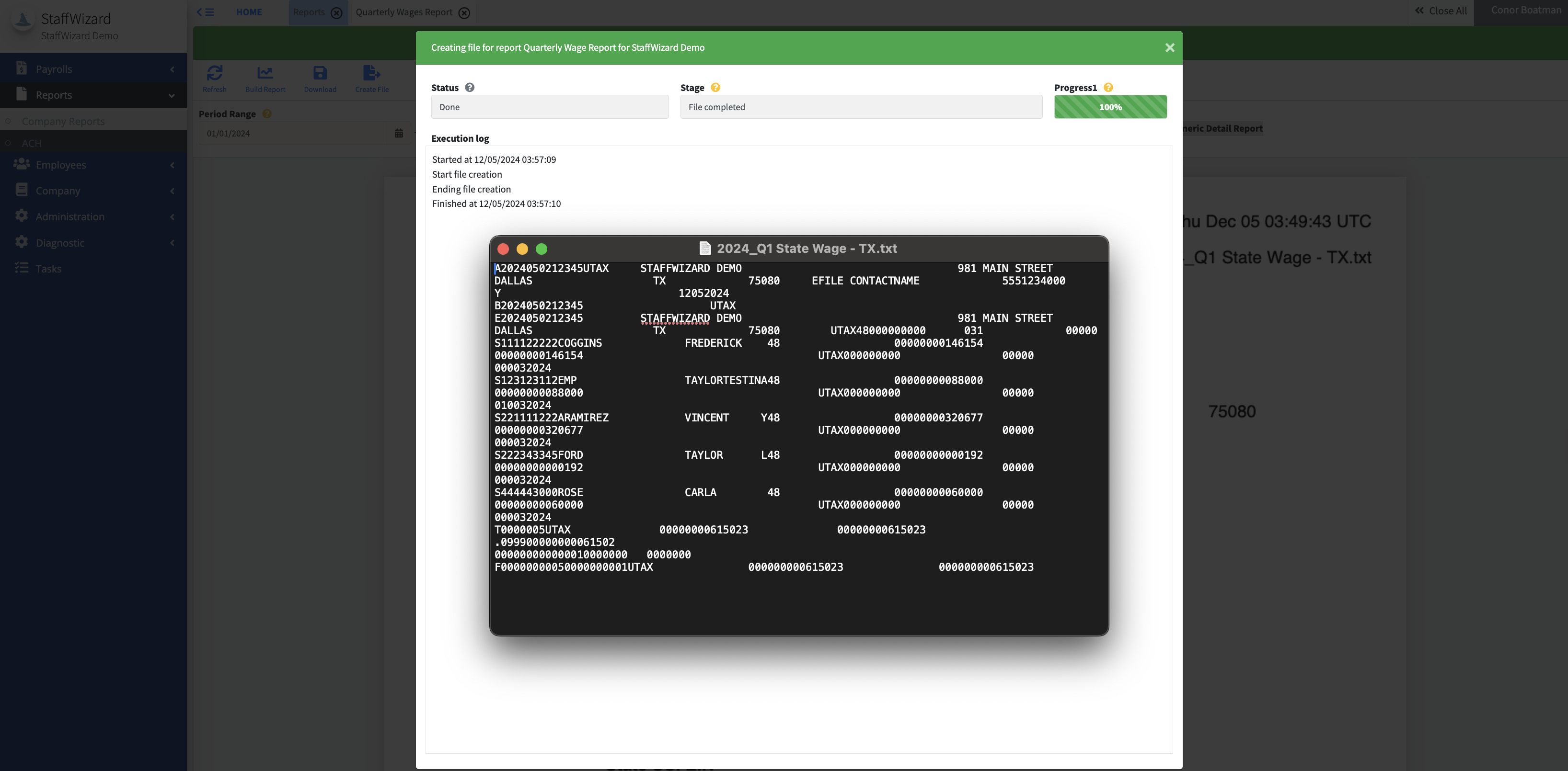 In certain states, electronic submission is accepted. To create the electronic e-file, make sure the time period is selected as well as the state you wish to file for, press "Create File" which will generate a ".txt" file to your local device.