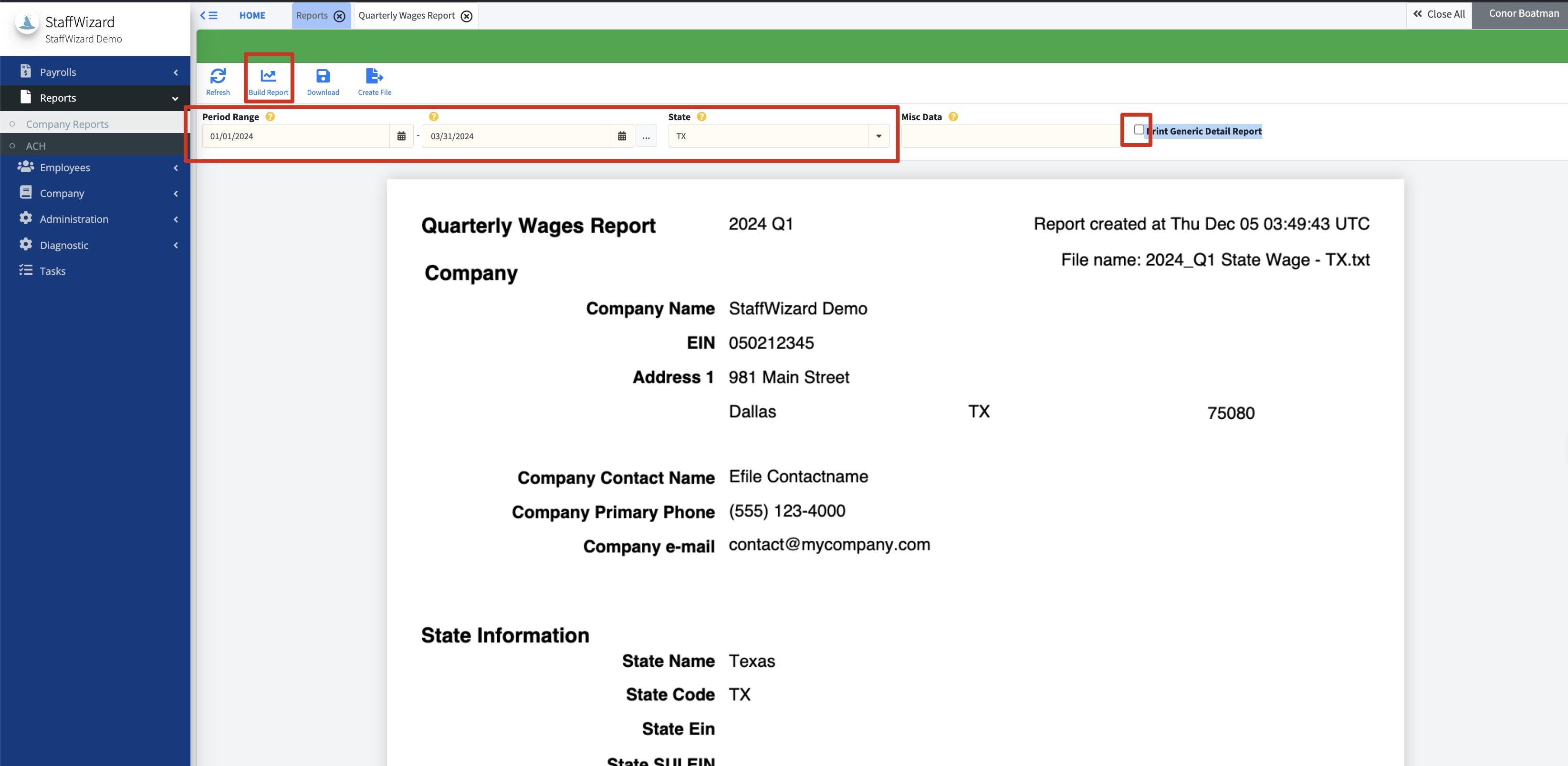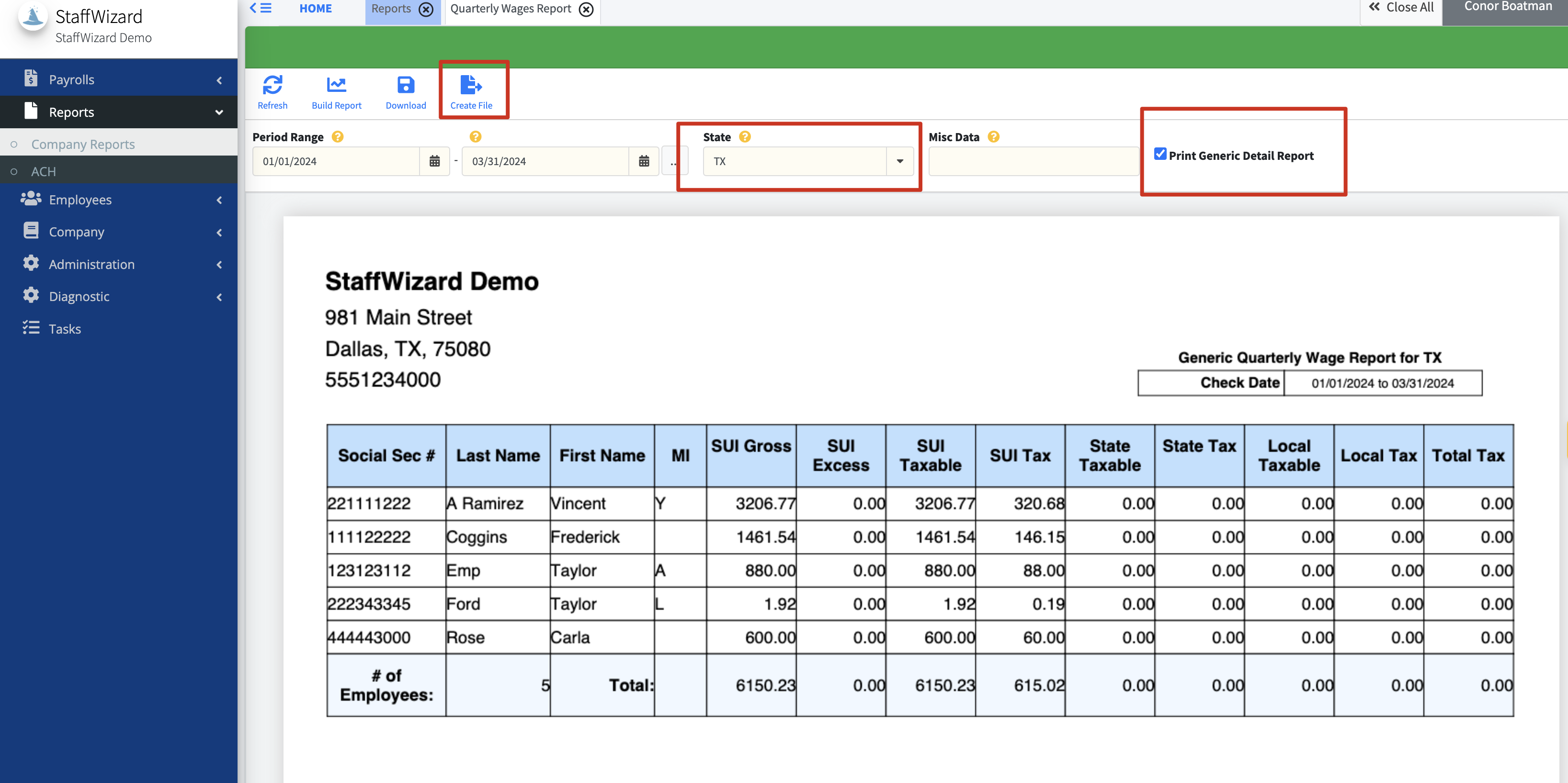 To access this report, select "Reports" on the left-hand side and then locate the "Quarterly Wage Report". Using the highlighted box, either select the quarter or manually type in the period range.