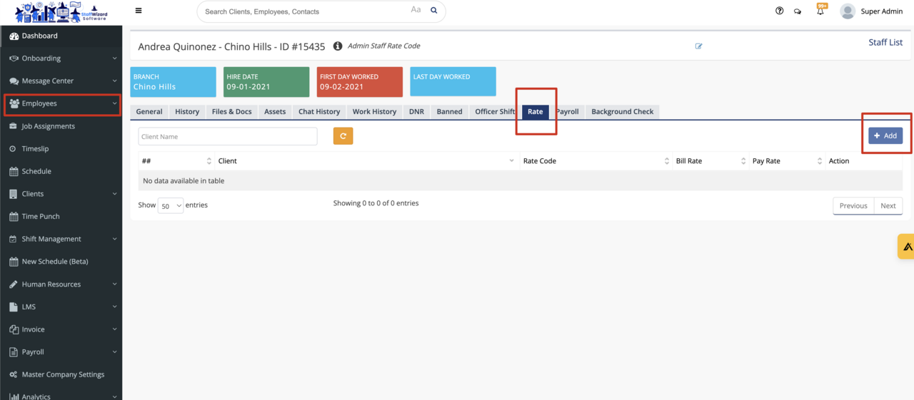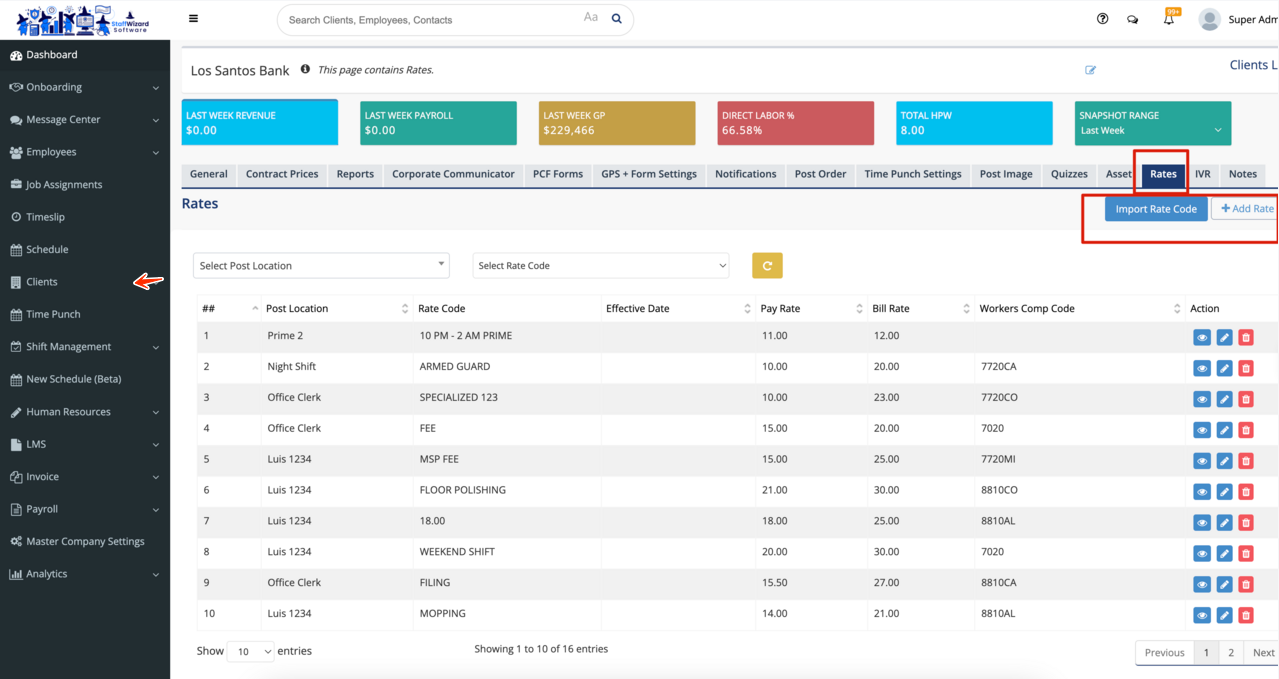 Rate Codes are one of multiple tiers that can be utilized for the payroll and billing hierarchy. To access them, navigate to the "Clients" module, and once there, open a client general information, then look to the top tabs for one called "Rate".