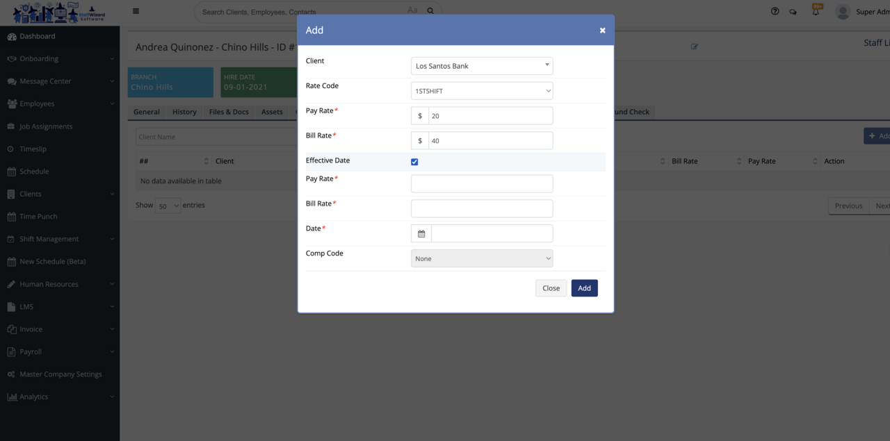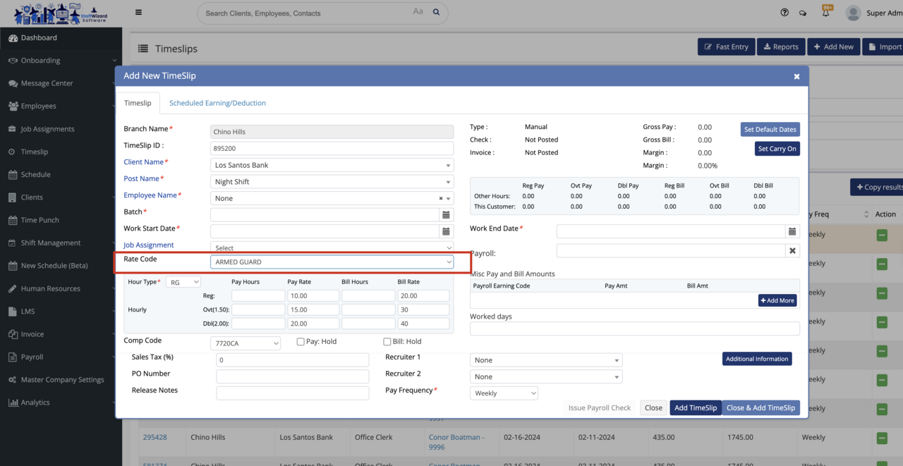 Rate Codes can be added or modified from this screen. Rate Codes are then assigned to work sites that can then be associated with any shift or job associated with that specific worksite and will override the first level of the payroll and billing hierarchy which is the worksite/job level.
