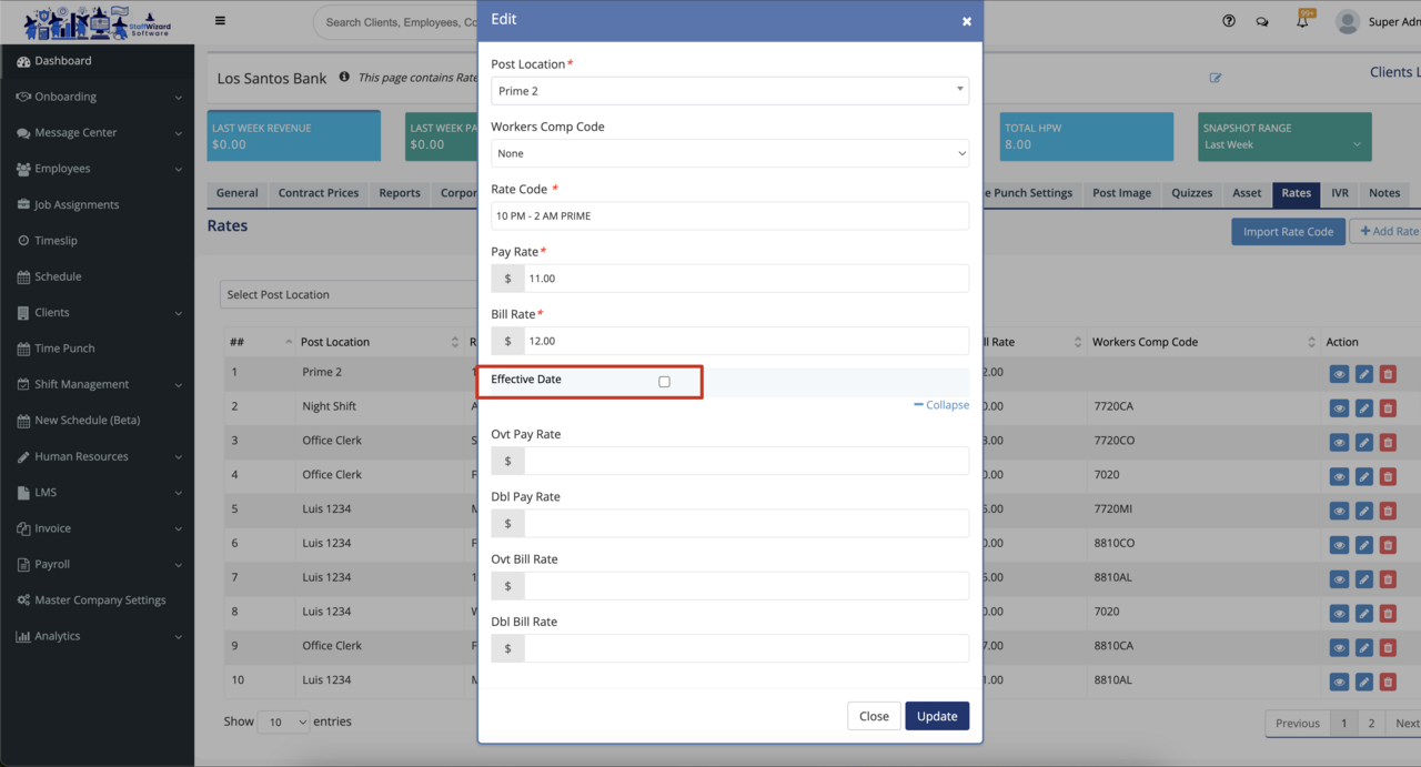 Furthermore, Pay/Bill at the rates assigned to the rate code in the employee profile. In all cases of a pay and bill rate field, there will be a partnered effective date field that allows you to have the rates change on a specific date.