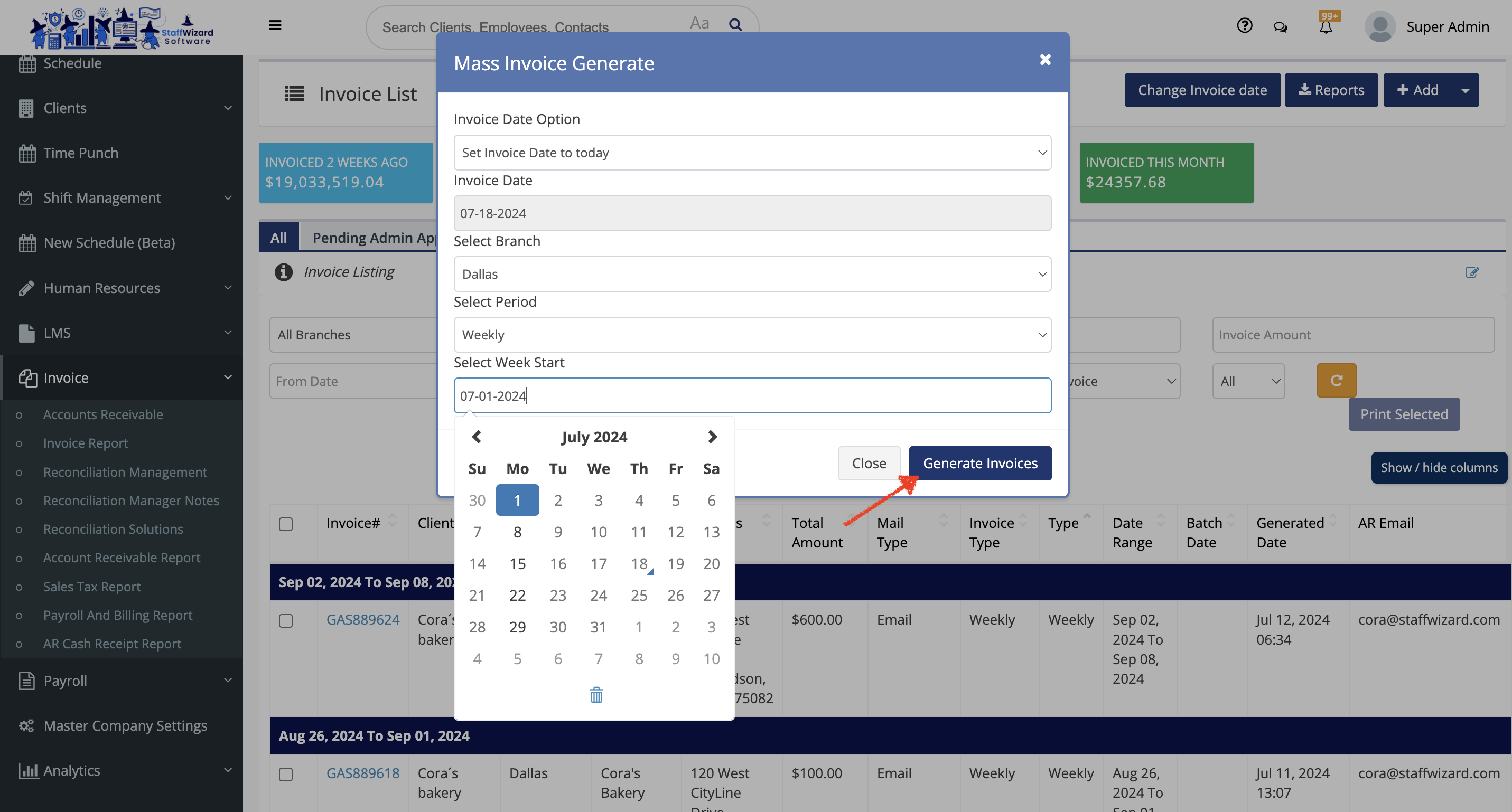 - On the main menu on the left-hand side of the StaffWizard page, under the 'Invoice' tab, select. "Invoice Report".