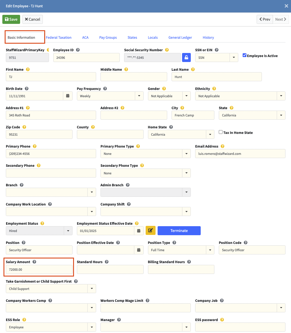 Locate the employee and either double-click on their profile or click the yellow [pencil] button to edit. Within the "Basic Information" tab, find the "Salary Amount" field and input their annual salary. This information will be used when processing their scheduled EDM during the payroll check procedure.