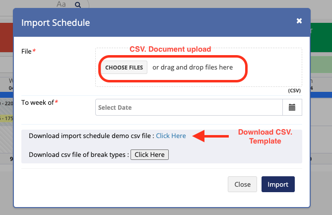 - Import Schedule: The Import Schedule feature allows you to upload schedules in bulk via CSV, making it easy to manage weekly setups or large-scale updates