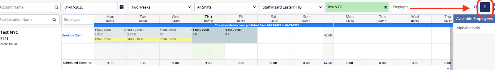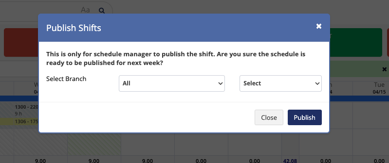 - Publish Schedules: Converts draft schedules to active ones, making them visible to employees. Notifications may be triggered based on system settings.