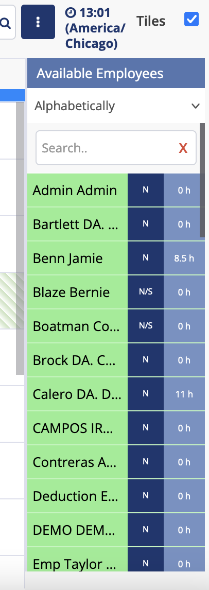 8. On the right-hand side of your screen, after clicking the box to select employees for scheduling, you’ll see all available employees for your designated workplace. These employees will be displayed in green, and you’ll be able to search through them.