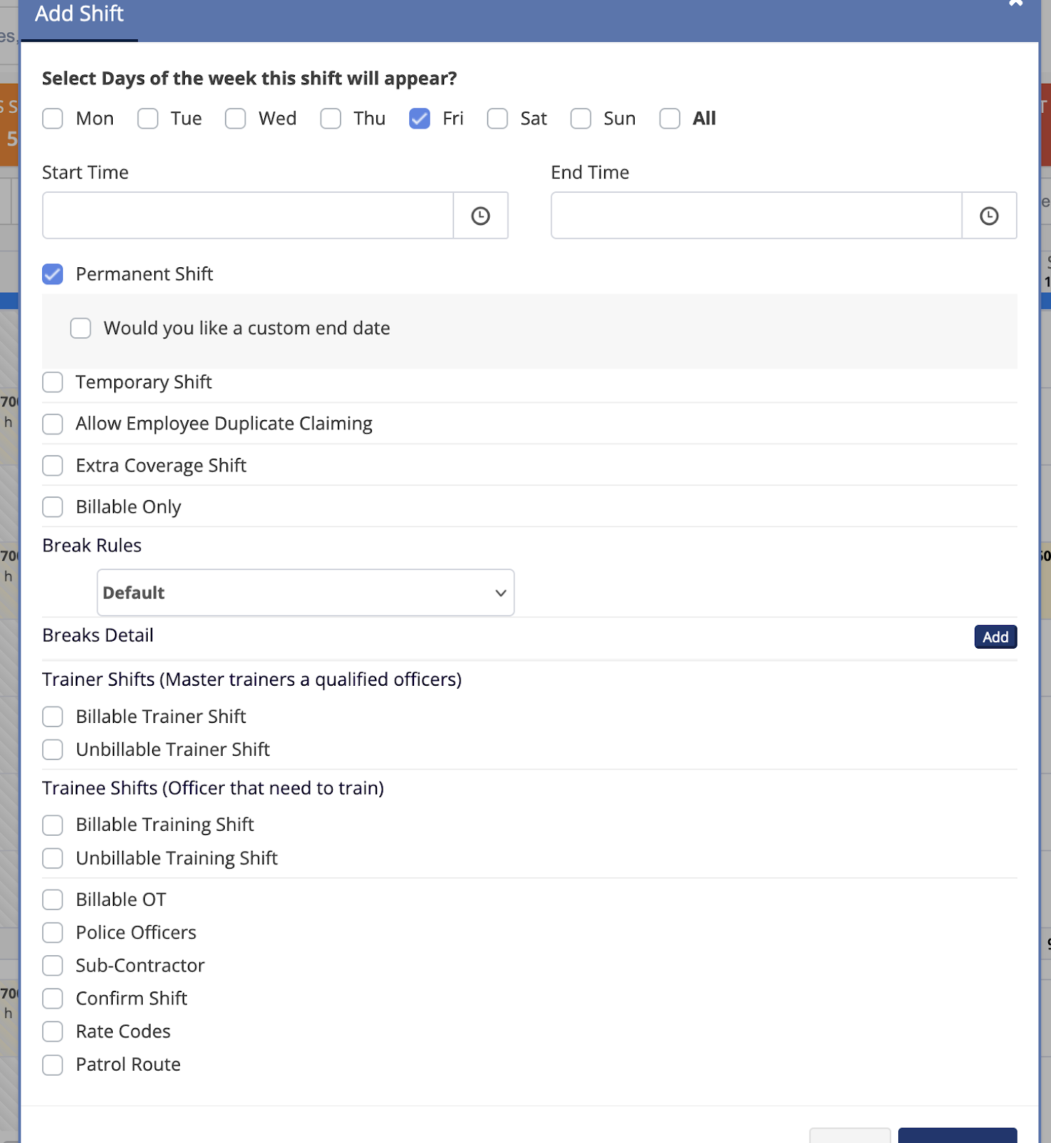4. This box will pull up providing all the information needed to add the shift.