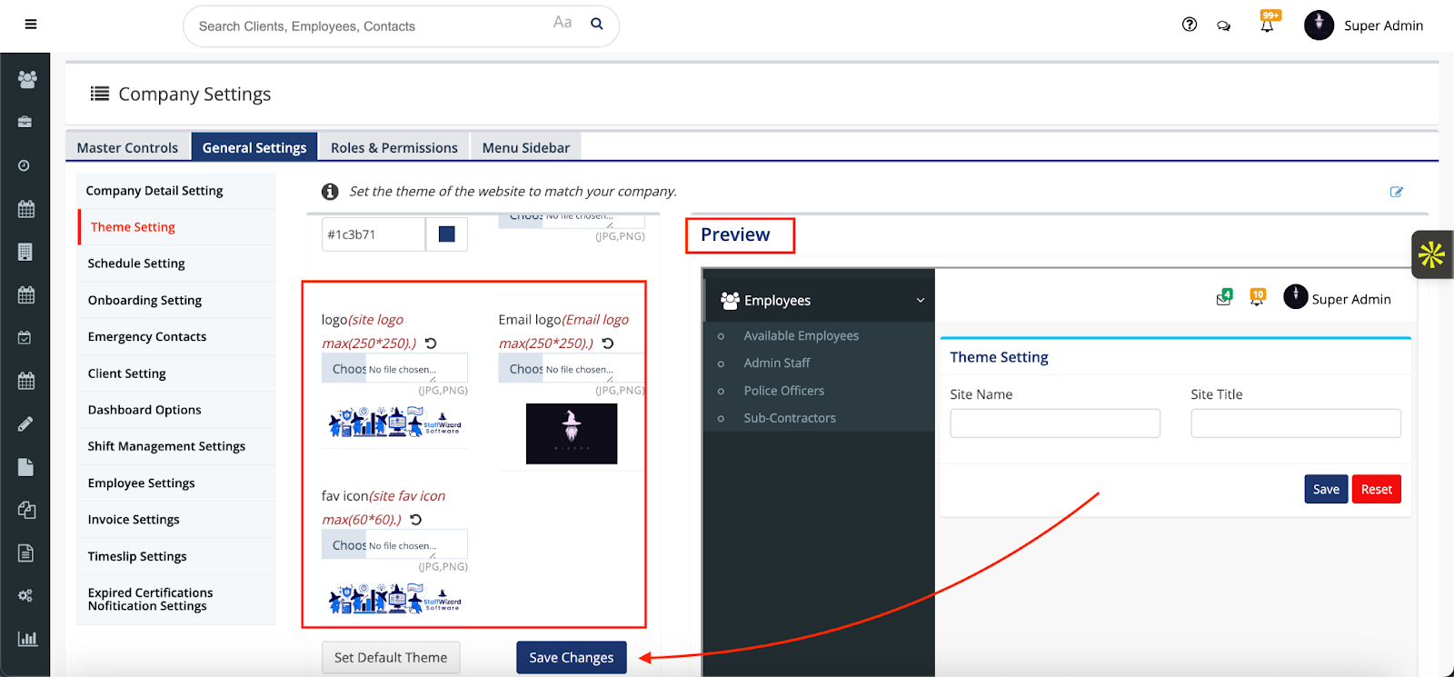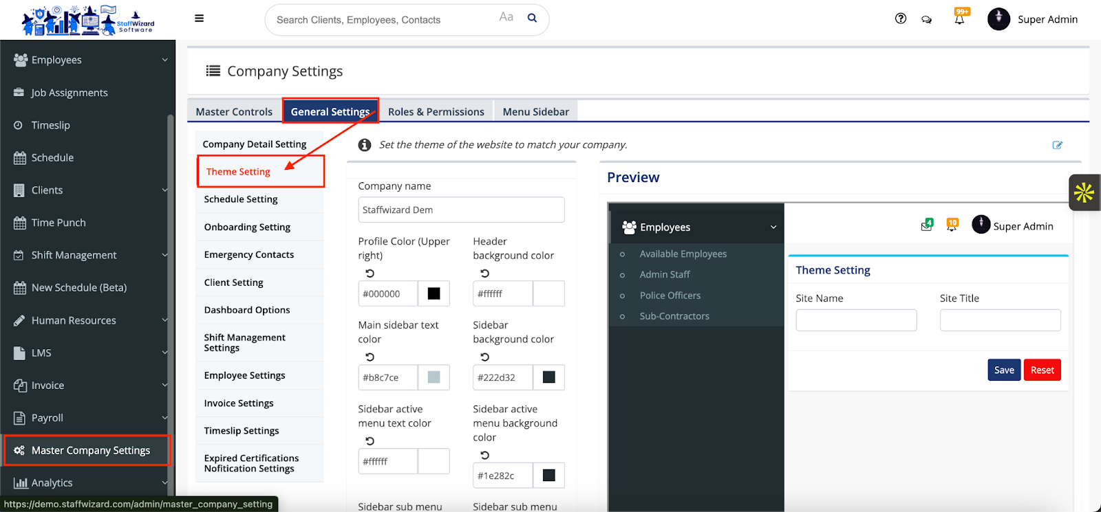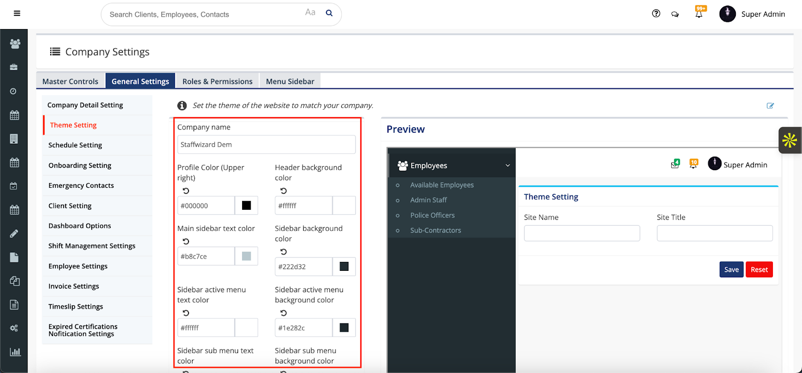 - In the Theme Settings page, you'll find editable boxes for each color element of your StaffWizard instance.