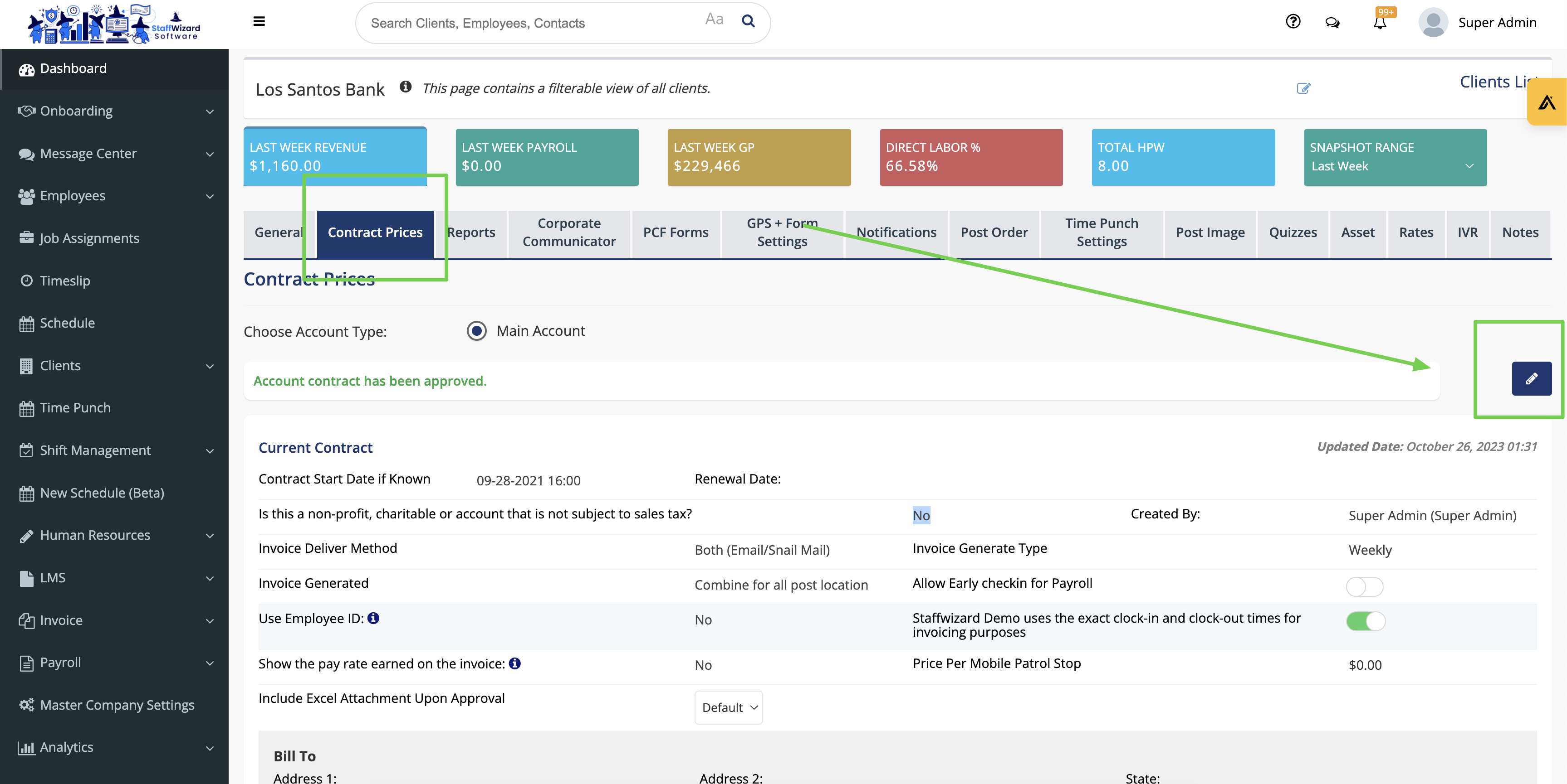 - Navigate to the "Contract Prices" tab in the client profile and hit edit which is the grey square with the pencil on the right side next to the green box.