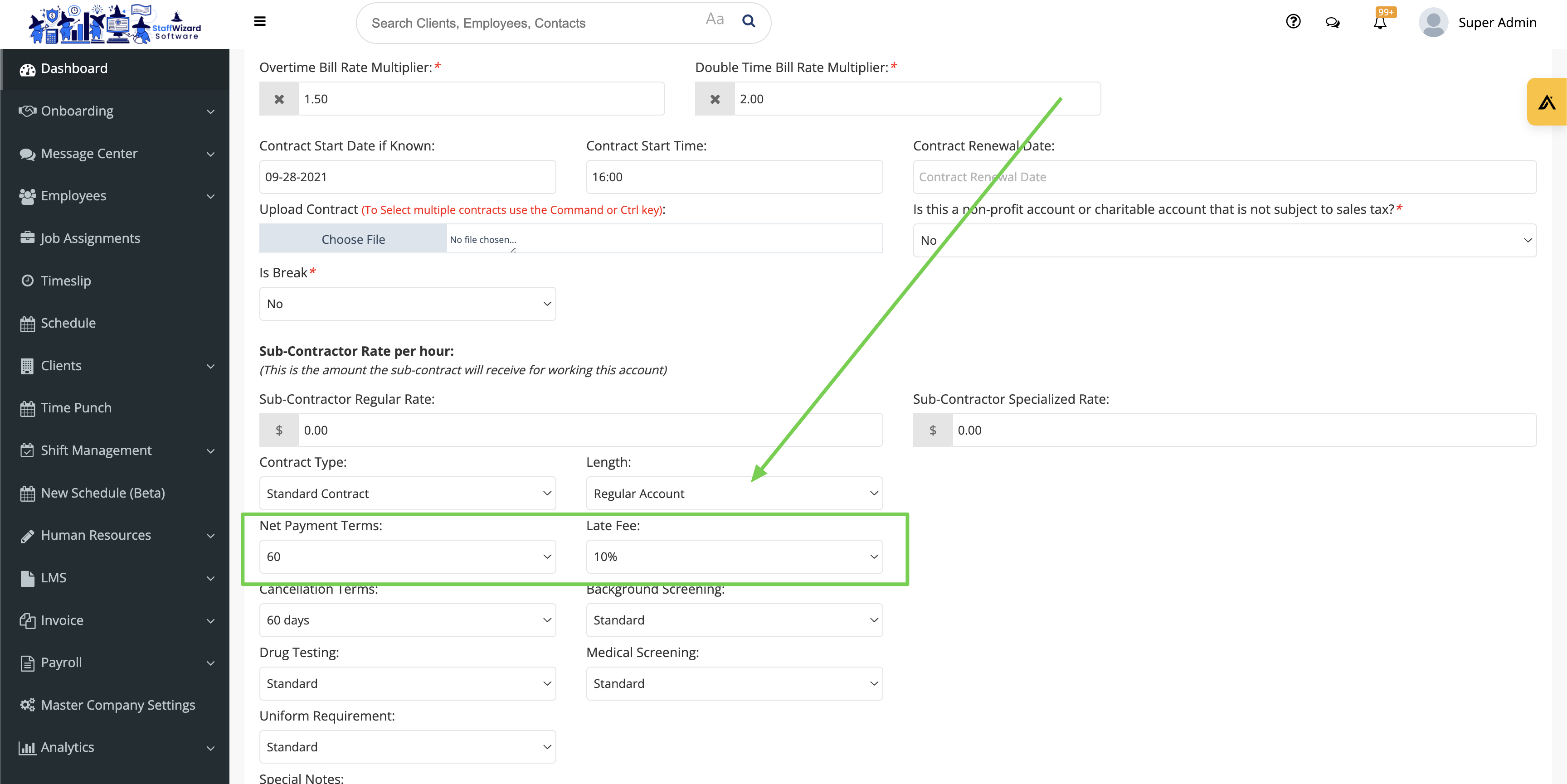 - Once the edit button is pressed, the screen will automatically scroll down. Find a field that reads "Net Payment Terms". Whatever value is placed here, will determine how long this specific company has to pay their invoice and when a late fee will be added.