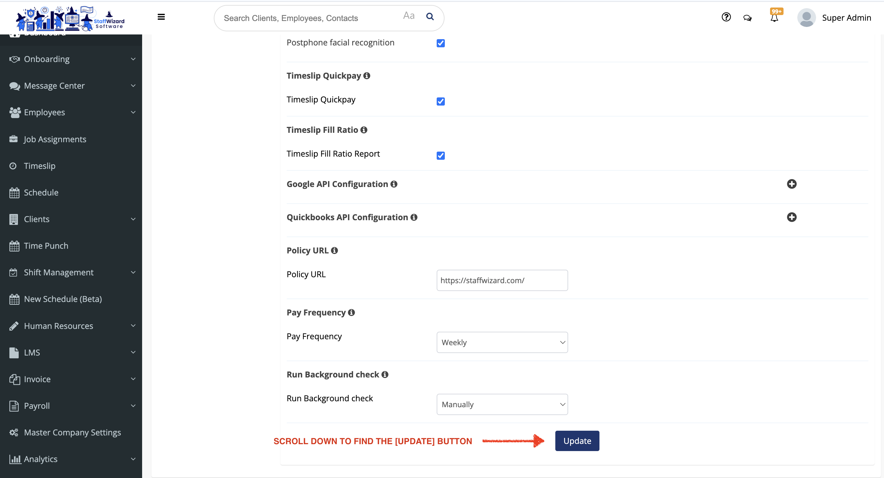- On the main menu on the left-hand side of the StaffWizard page, under the 'Master Company Settings' tab, select the "General Settings" tab on the top of the panel that was displayed.