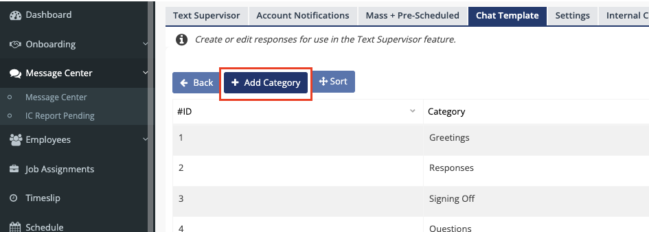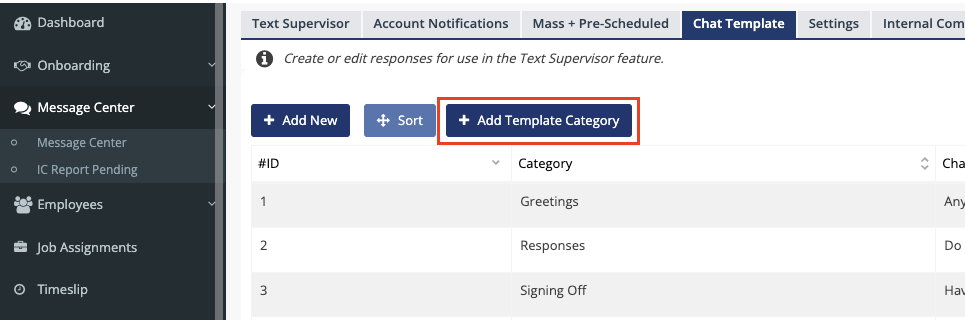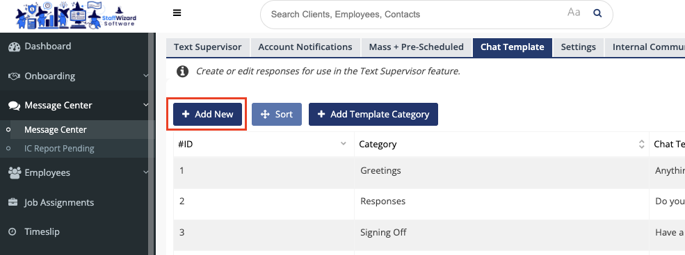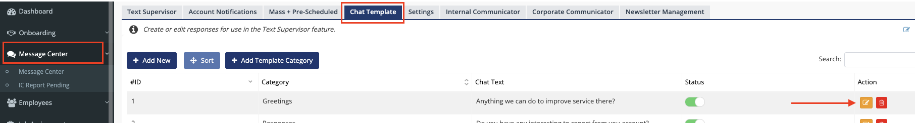- Navigate to the Message Center module > Click on the Chat Template tab.