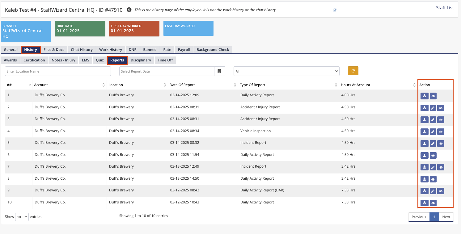 Here, you'll see a list of all reports created by the employee, including the account name, location, report date, report type, hours worked at the account, and an Action column with options to view, download, or edit certain reports.