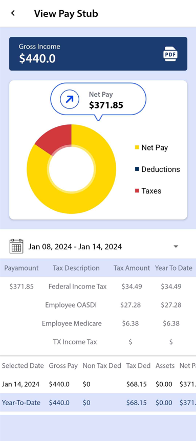 Viewing Pay Stubs Access Payroll Information: Open the side menu and select 'Payroll', then tap 'View Pay Stub'. Review Pay Stubs: Browse through a list of your previous payroll details, including earnings and deductions. Related to Mobile Application