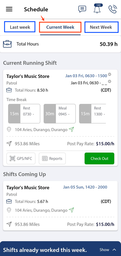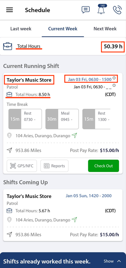 - Each shift will display: